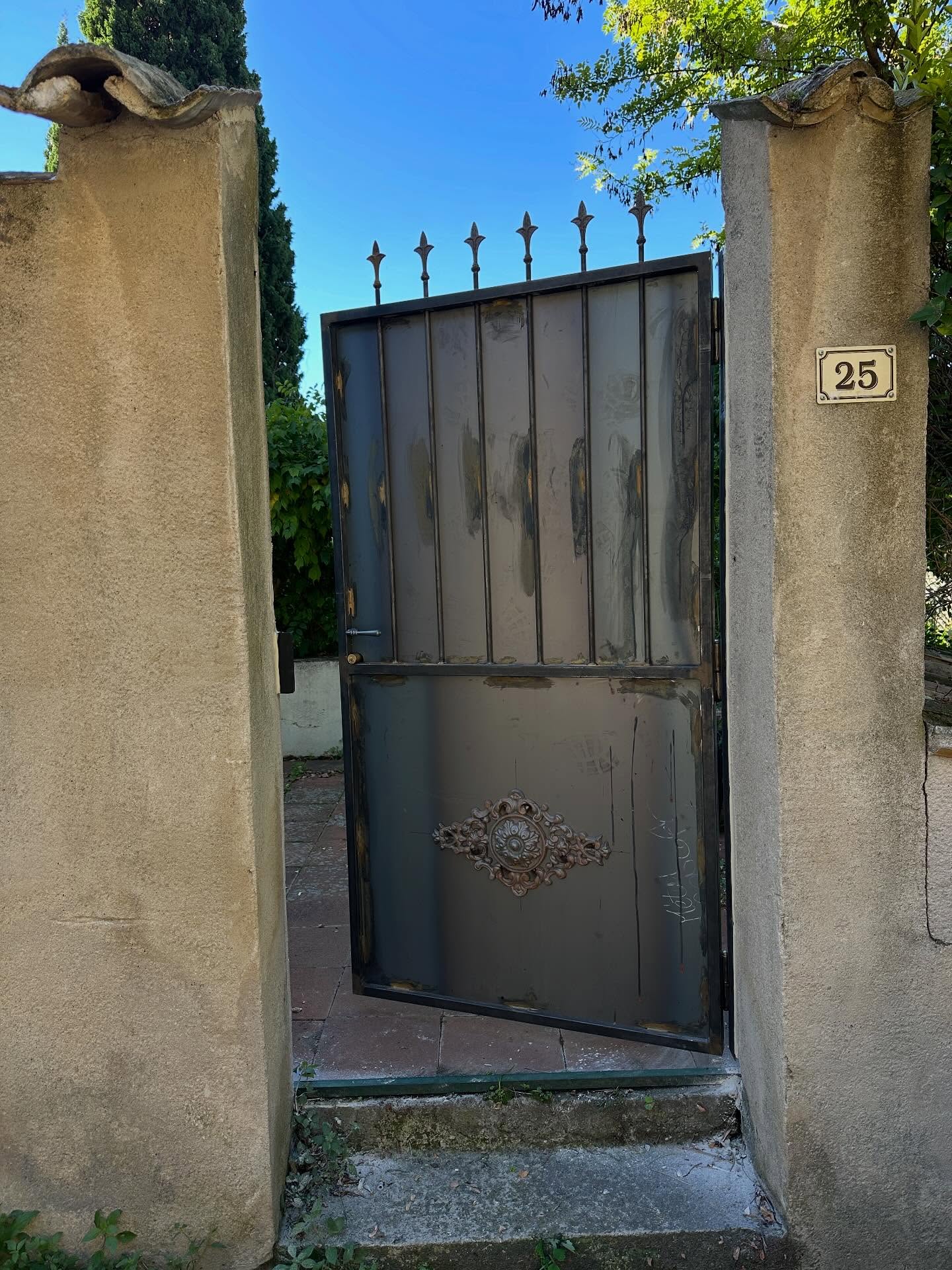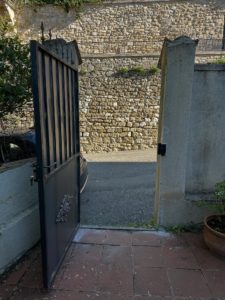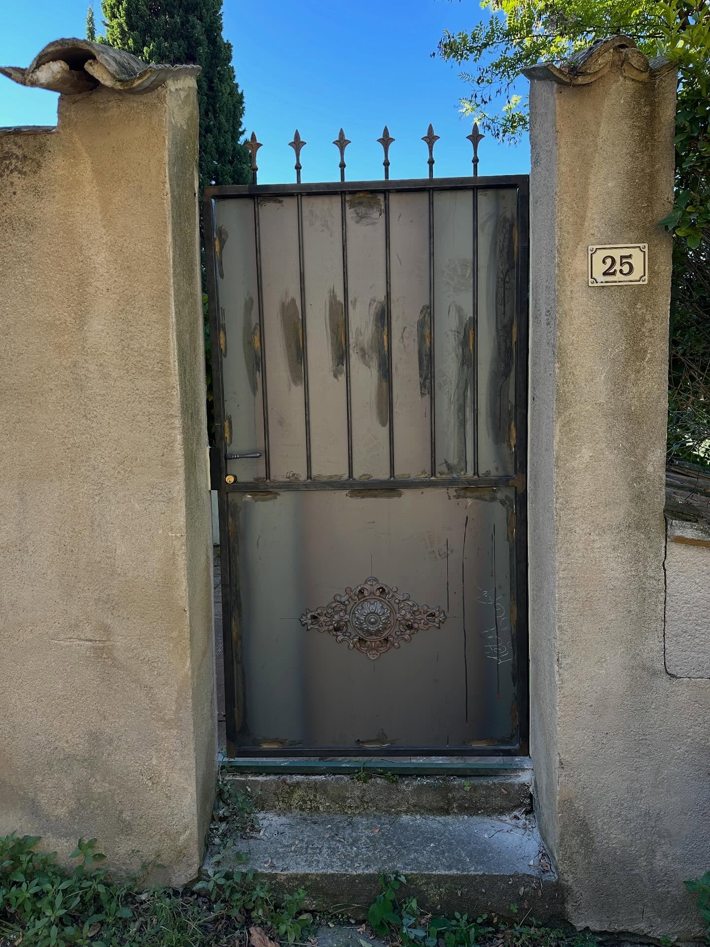 Création et pose d’un portillon en acier sur mesure pour remplacer un vieux portillon en bois, finition brute pour le laisser rouiller avec le temps.